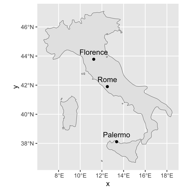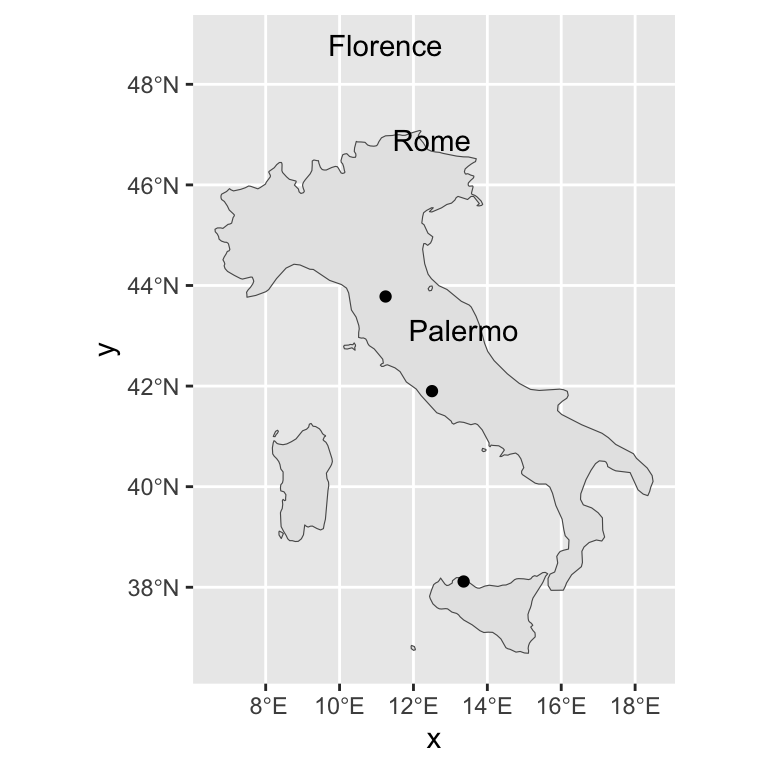 Remember that nudging uses the values in the axis. If you use nudge_y = 0.5, you are indeed nudging. You’re moving the city labels up by half a meter. That’s why you don’t see any changes!