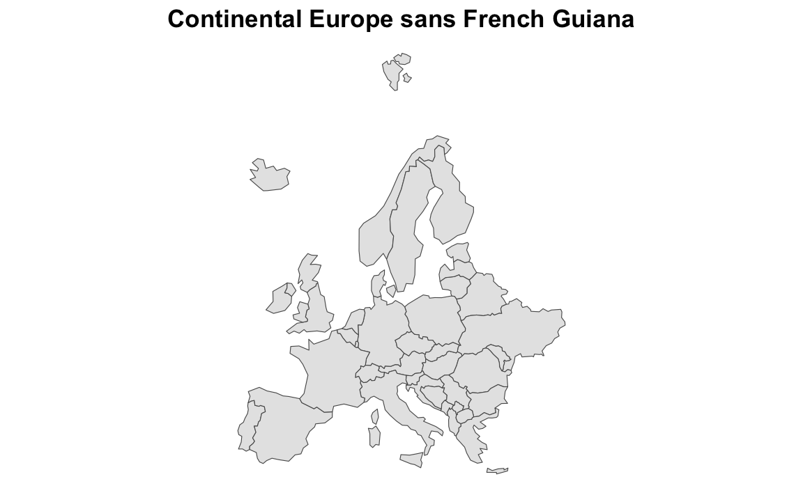 world_shapes_map_units |>filter(continent =="Europe", sovereignt !="Russia") |>ggplot() +geom_sf() +labs(title ="Continental Europe sans French Guiana") +coord_sf(crs =st_crs("EPSG:3035")) +theme_void() +theme(plot.title =element_text(face ="bold", hjust =0.5))