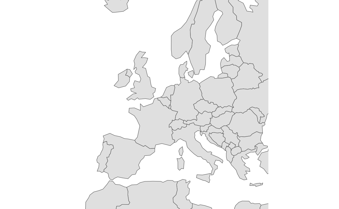 Alternatively, if you don’t want to filter countries out, you can crop the plotting window to zoom in on specific parts of the map. For example, in that Europe map ↑ we removed Russia because it’s so wide, but that leaves a weird border on the eastern edge of the map. We’re also missing Turkey and North Africa. It might be better to include all those countries and zoom in on continental Europe instead. This also makes it so you don’t have to worry about countries and map units.