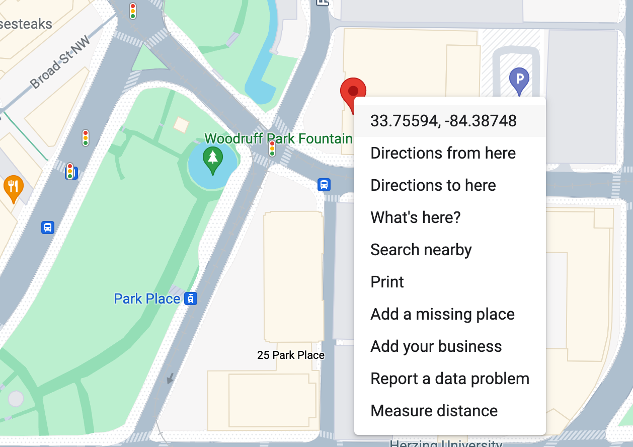 When you copy/paste geographic coordinates from Google Maps, you’ll get numbers that have a ton of decimal points, even though the website doesn’t show that many. For instance, here’s 55 Park Place (my office building on campus):