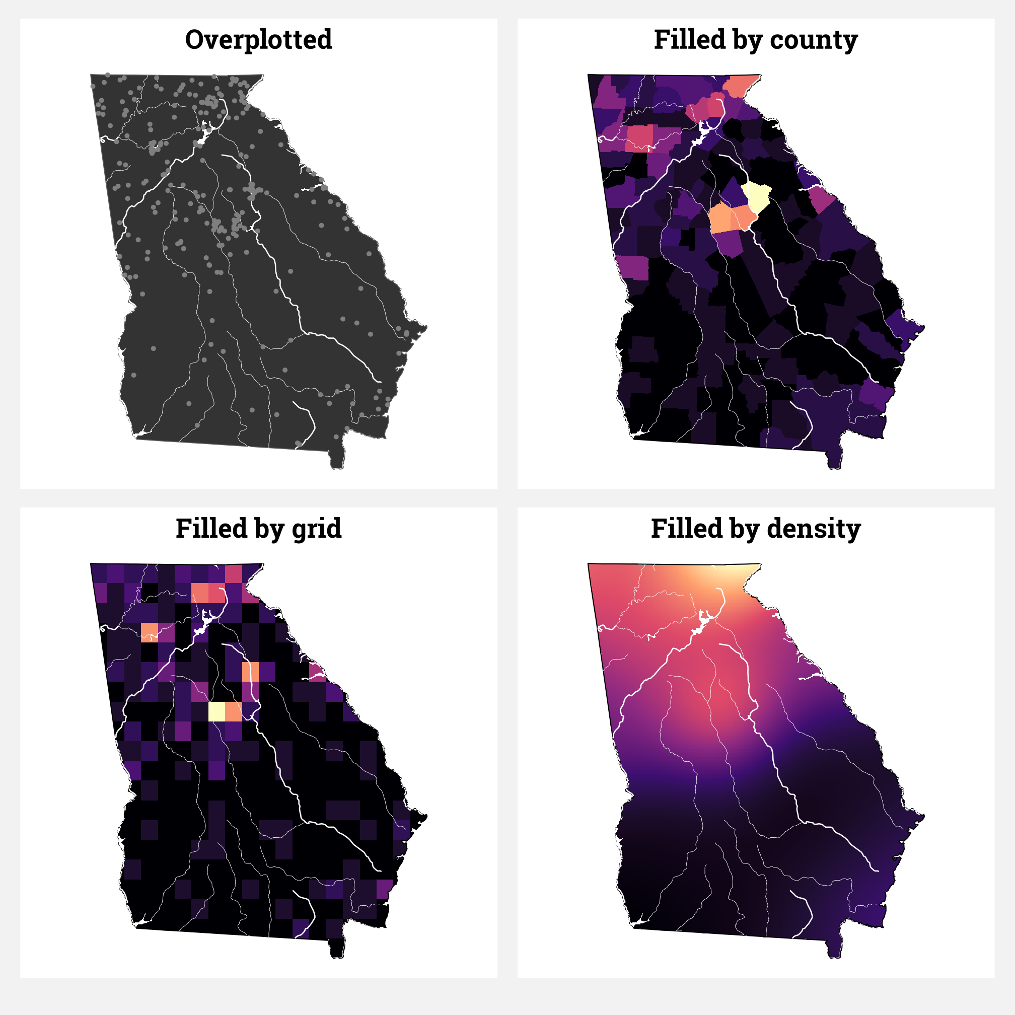 Choropleths are helpful for filling regions of a map (like countries, states, counties, etc.) by a specific value, but you can also fill an entire map area with a gradient too! This is a good approach for dealing with overplotting. See this post to learn how to do it: